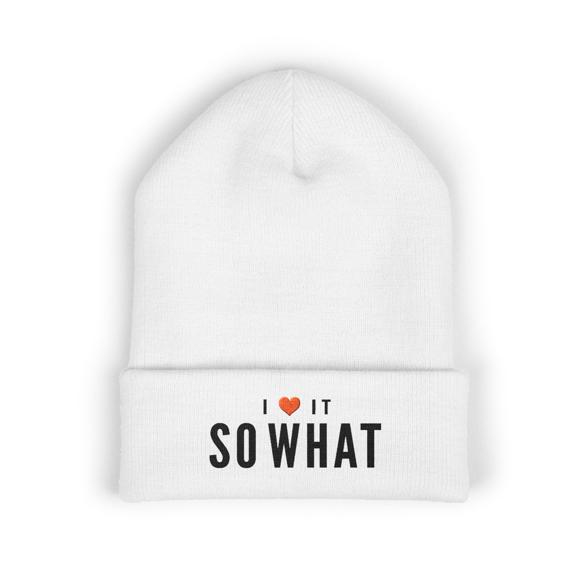 Embroidered cuffed beanie with quiet attitude. Soft acrylic, low-profile design — warmth with a bit of humor.